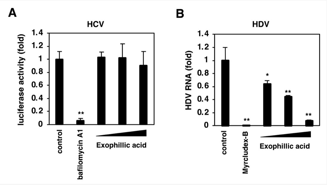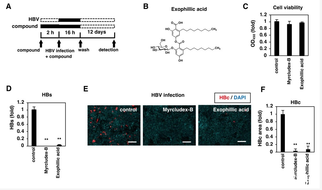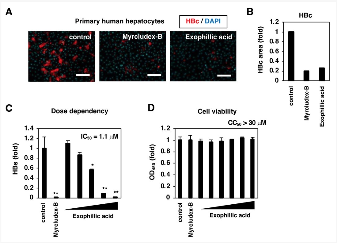 这项研究中,研究人员发现了真菌次级代谢产物——嗜外酸(exophillic acid)抑制HBV感染,其50%的最大抑制浓度(IC50)为 1.1 μM,50%的细胞毒性浓度(CC50)在原代人肝细胞中 > 30 μM。 嗜外酸抑制 preS1 介导的病毒对细胞的附着,但不影响细胞内的HBV复制。
