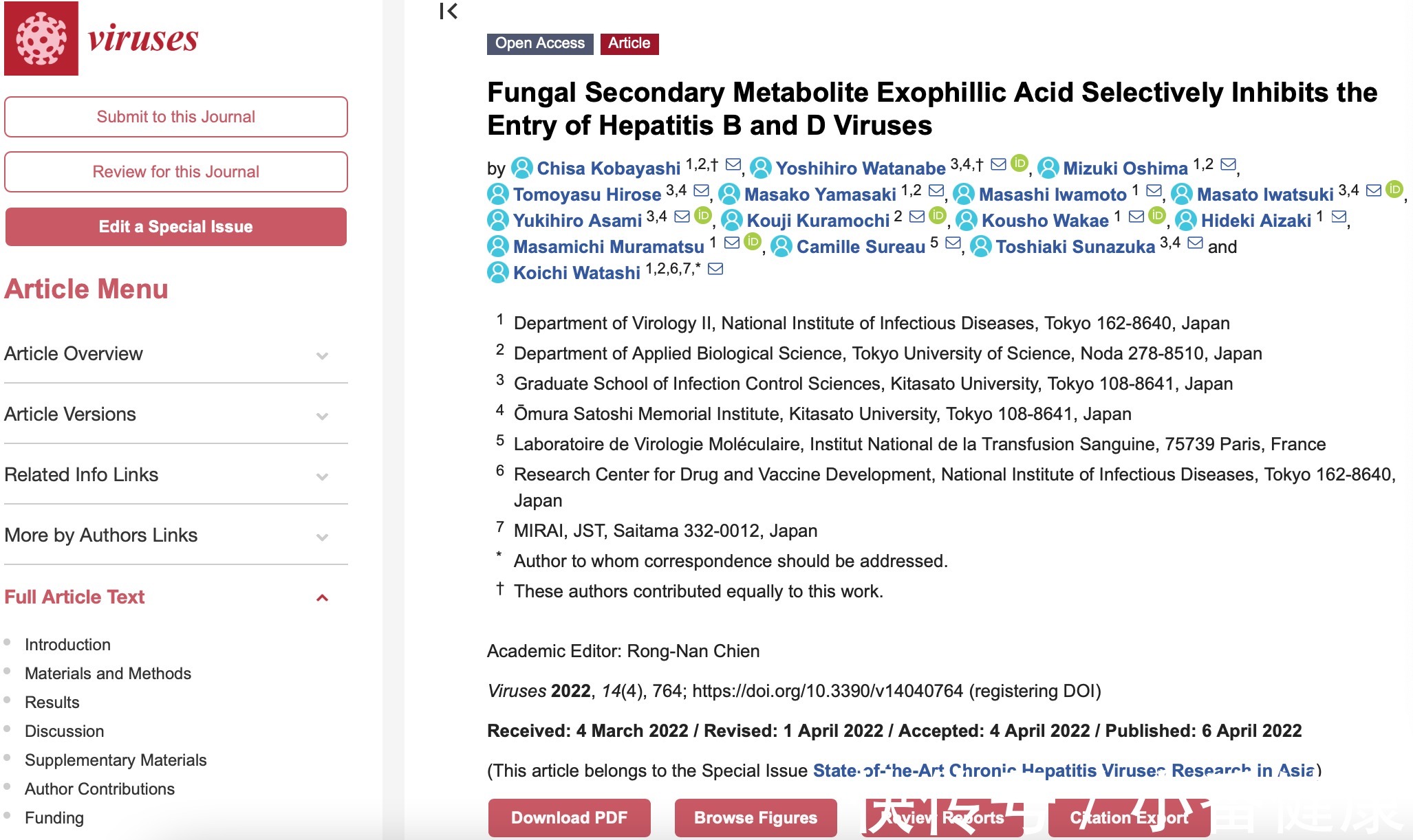 病毒的进入过程,对于感染的起始、传播和维持起着至关重要的作用。在科学杂志Viruses上,日本研究人员发表了一项研究,即真菌次级代谢产物嗜外酸可以选择性抑制乙肝病毒和丁肝病毒的进入。